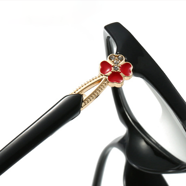 The PC frame is adorned with delicate floral embellishments, adding a touch of elegance to the overall design. This unique detail makes these glasses not just functional but also a chic fashion accessory.、
